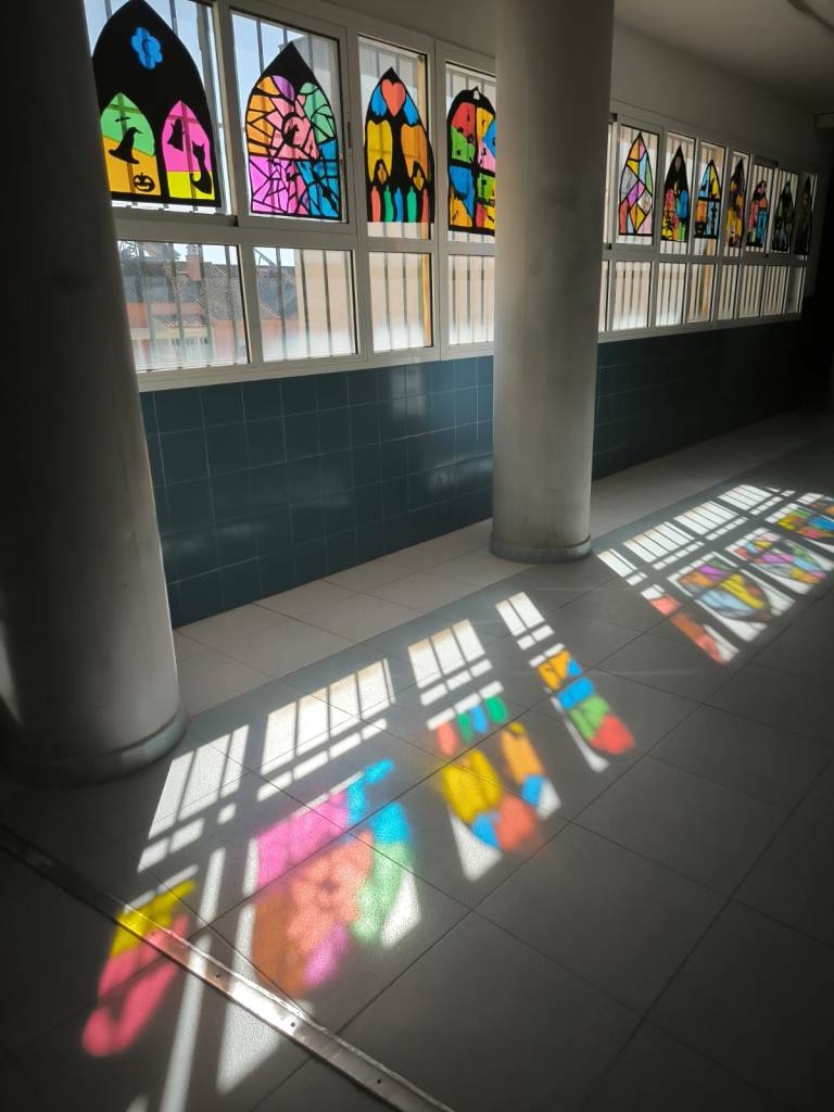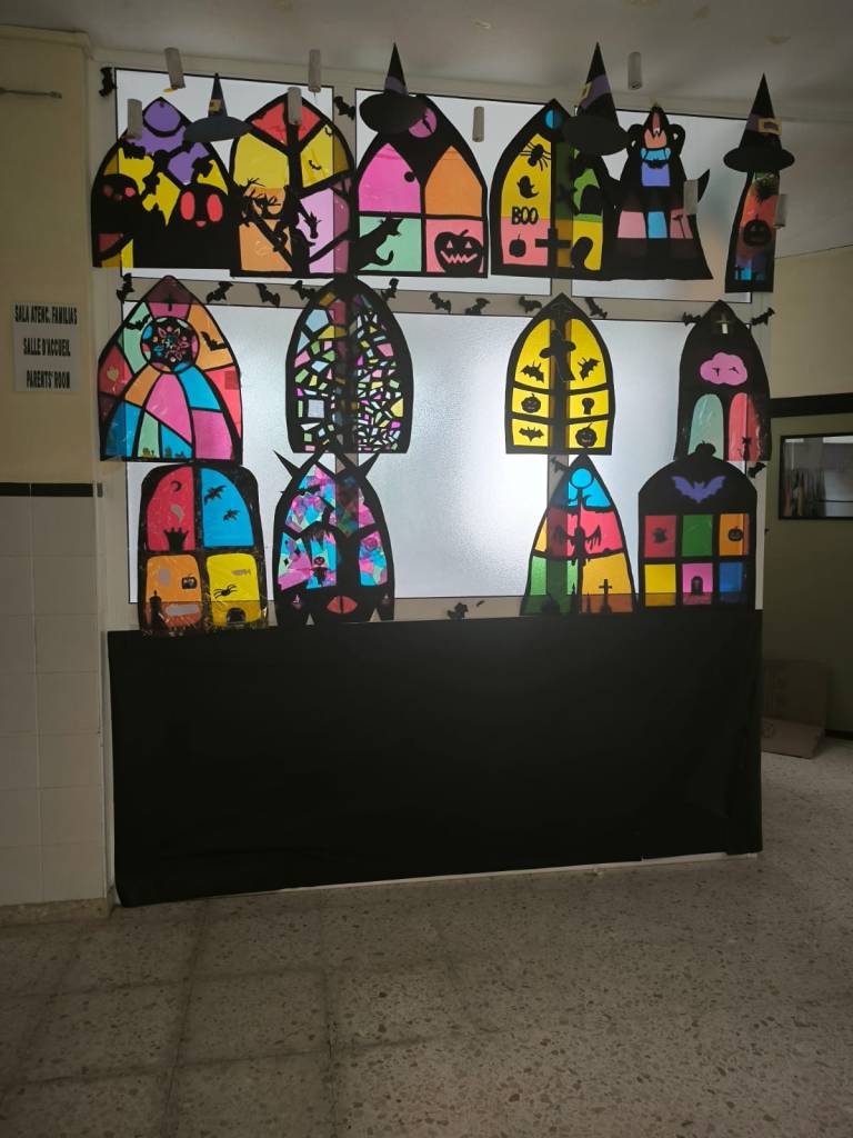 Nuestro alumnado de 1° ESO colaboró con la materia optativa de música para decorar con vidrieras góticas con motivos de Halloween.