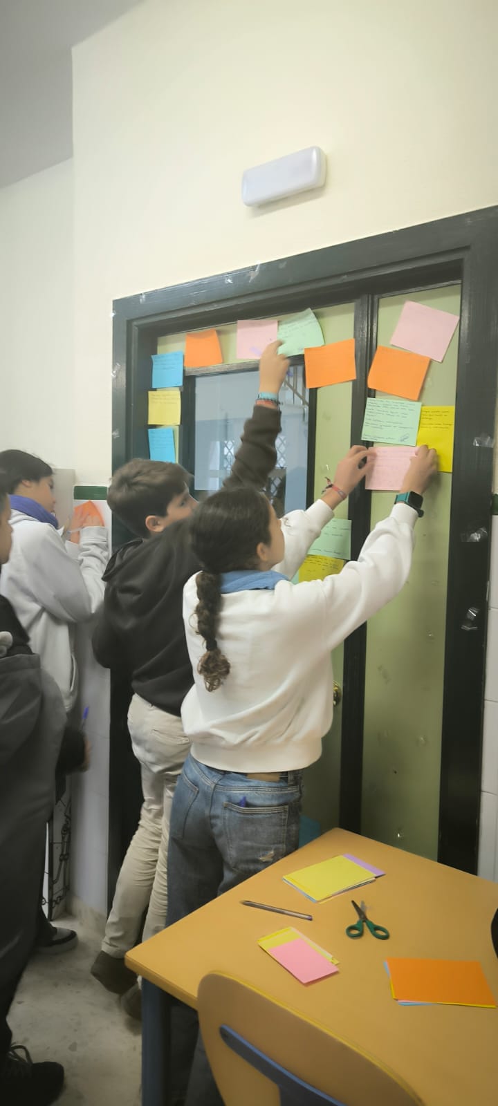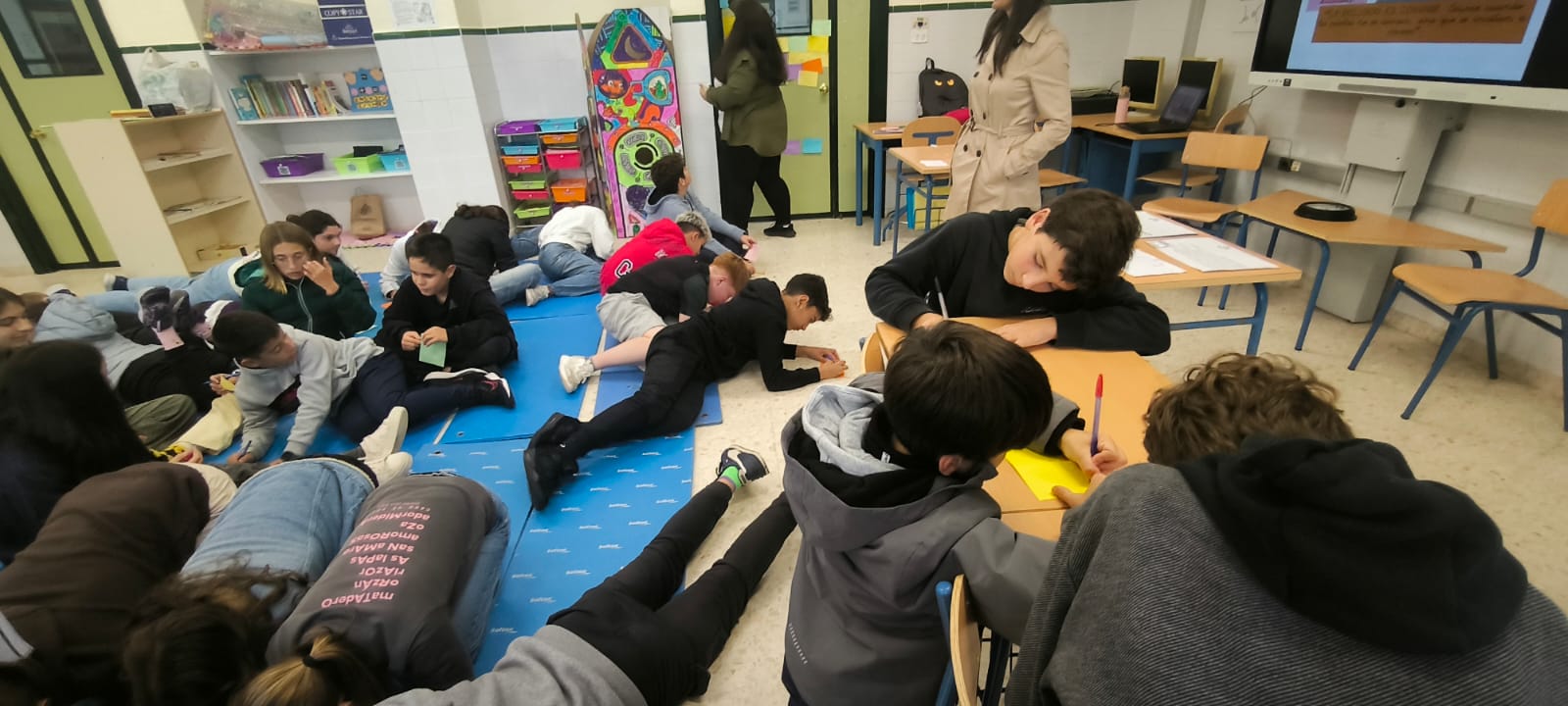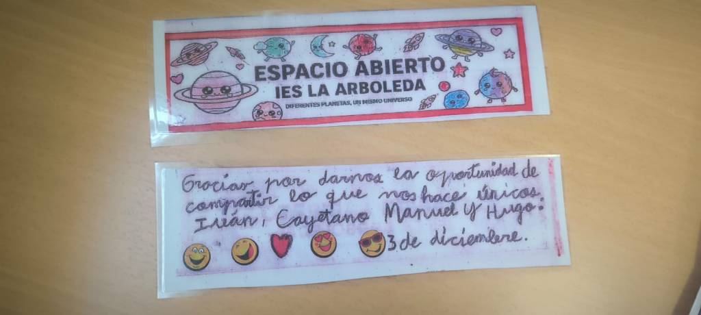 Y como todo gran encuentro necesita un recuerdo, han preparado marcapáginas personalizados, cada uno con una pequeña dedicatoria hecha con todo el cariño, para regalar a quienes venían a visitarnos. Pero atención, que aquí no acaba la cosa… También hemos invitado a todas las personas que han pasado por el aula a dejar su huella: una frase, una dedicatoria, un pensamiento bonito o incluso un dibujo espontáneo.